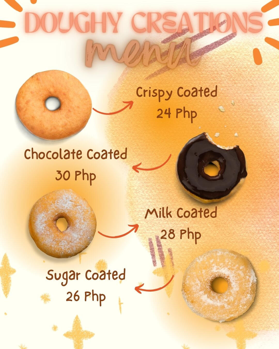 Doughy Creations' offers four flavors that ranges from crispy-coated, sugar-coated, milk-coated, and chocolate-coated. Order your now, through messaging us in our Facebook Page. Delivery schedule will be every Tuesday and Thursday.